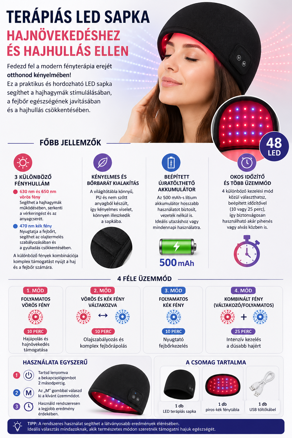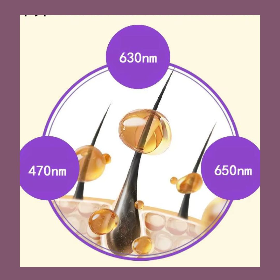 A készülék 48 darab LED fényforrást tartalmaz, amelyek különböző hullámhosszokon működnek. A vörös fény segítheti a vérkeringés fokozását és a hajhagymák stimulálását, míg a kék fény nyugtató hatású, támogatja a fejbőr egyensúlyát és segíthet az olajtermelés szabályozásában. A kombinált fényterápia komplex módon járul hozzá a haj és a fejbőr egészségéhez.